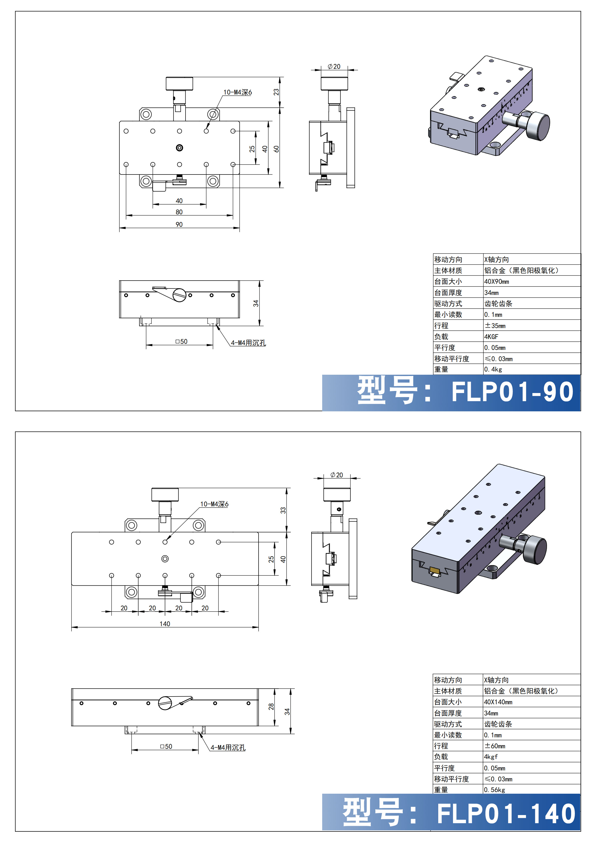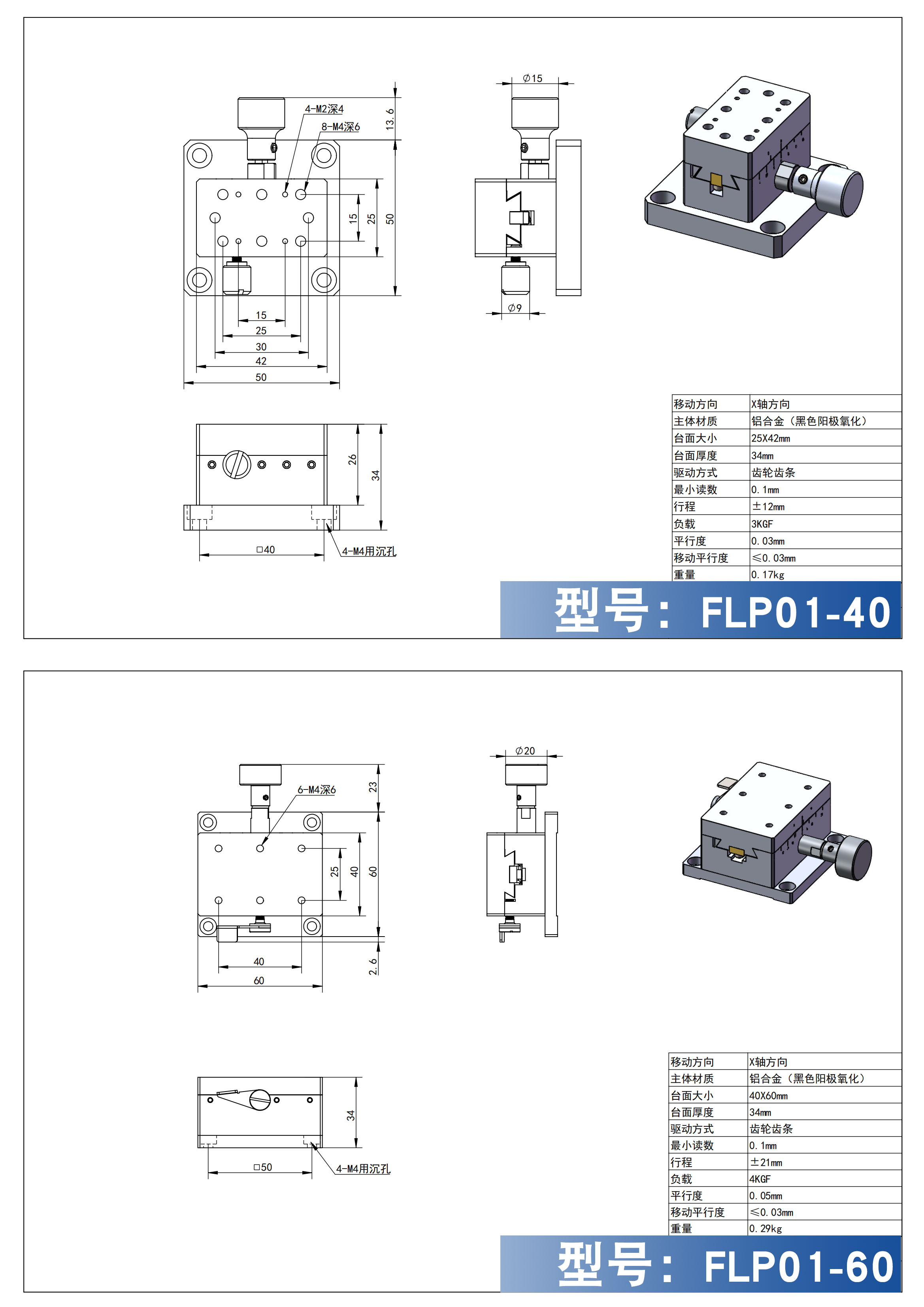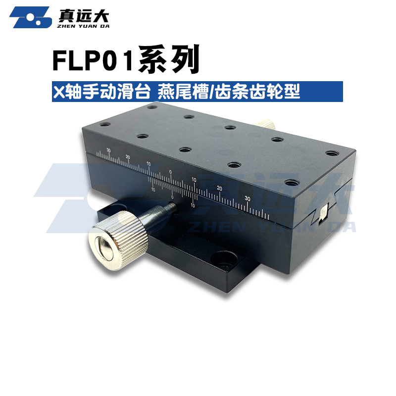 FLP01系列燕尾槽齿轮齿条型手动X轴滑台是一款高精度滑台,旋钮旋转1圈的移动量为18mm,能够实现快速进给。