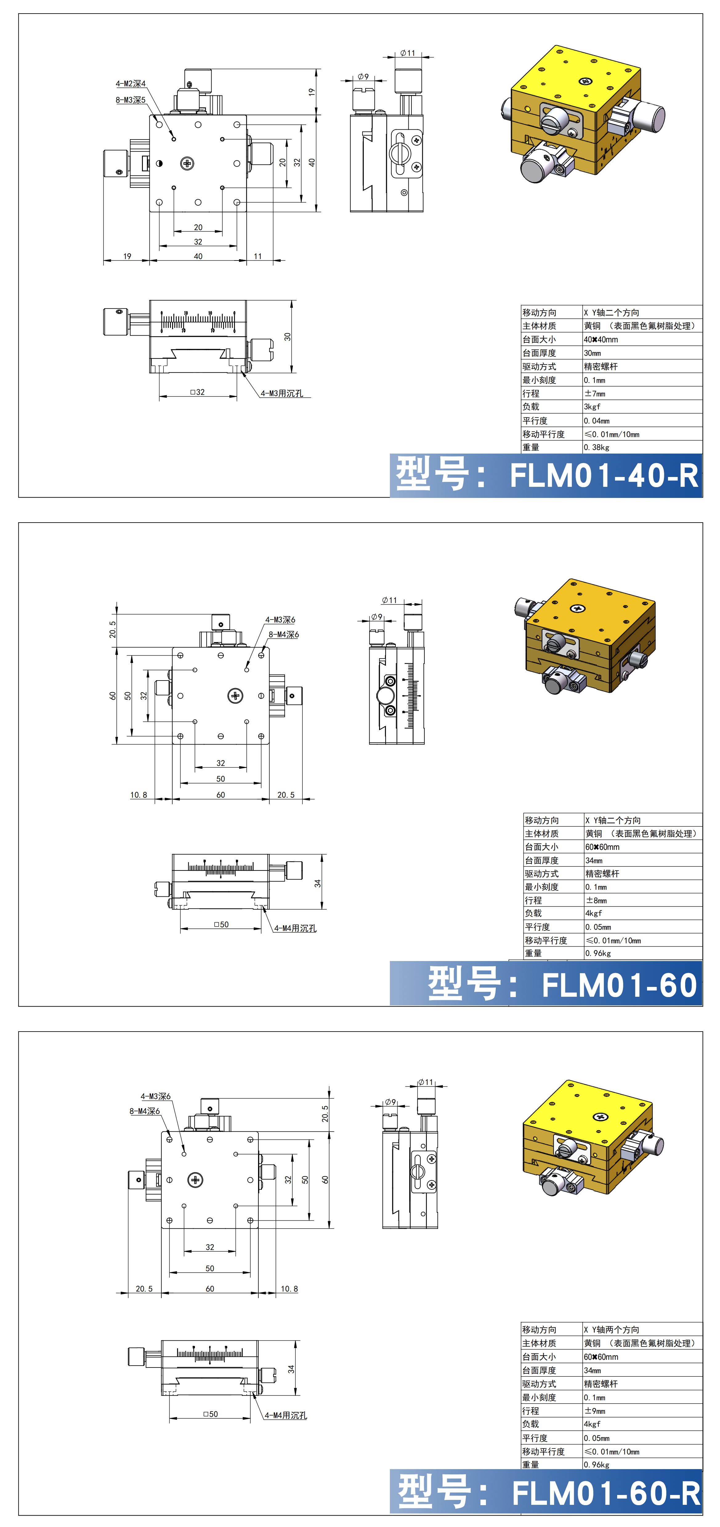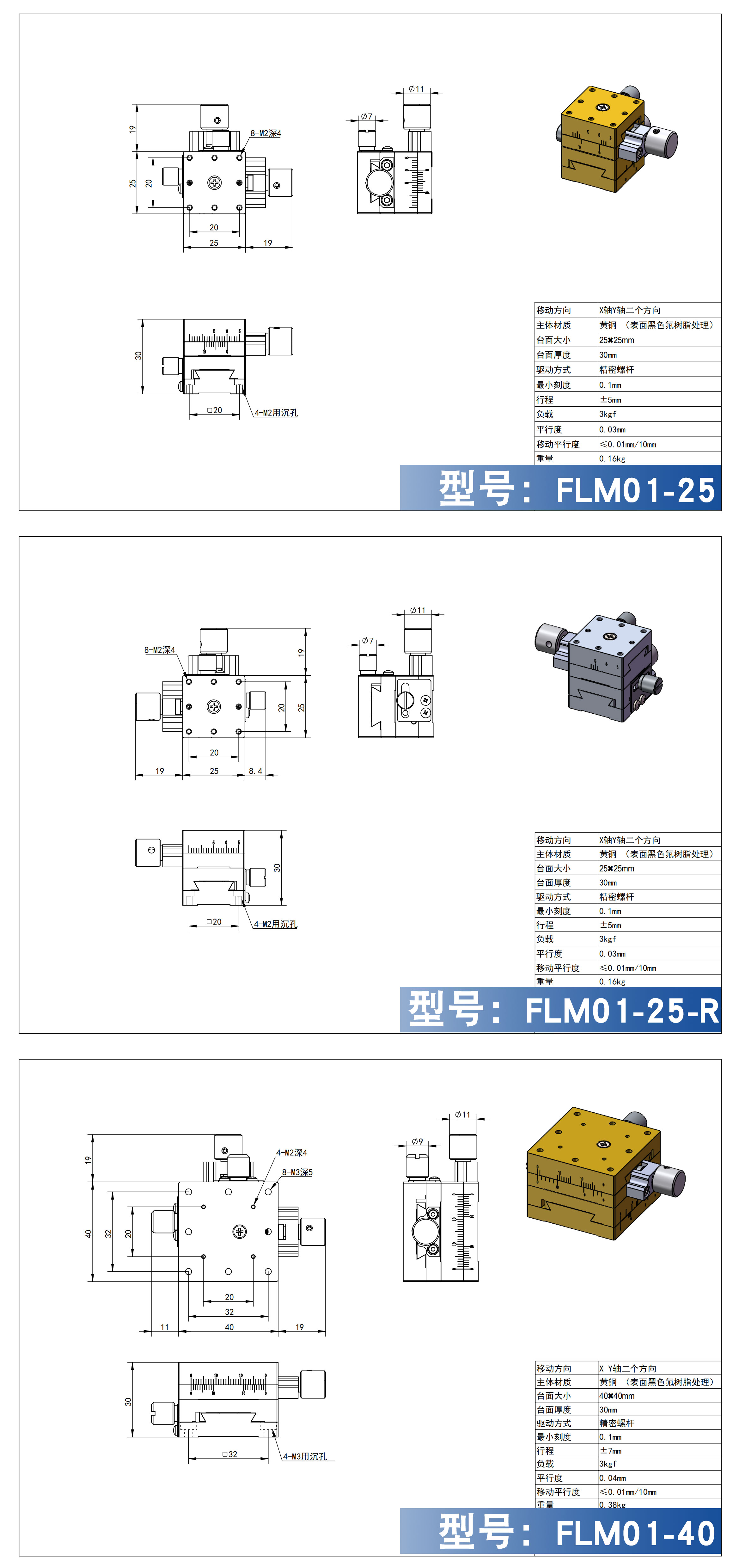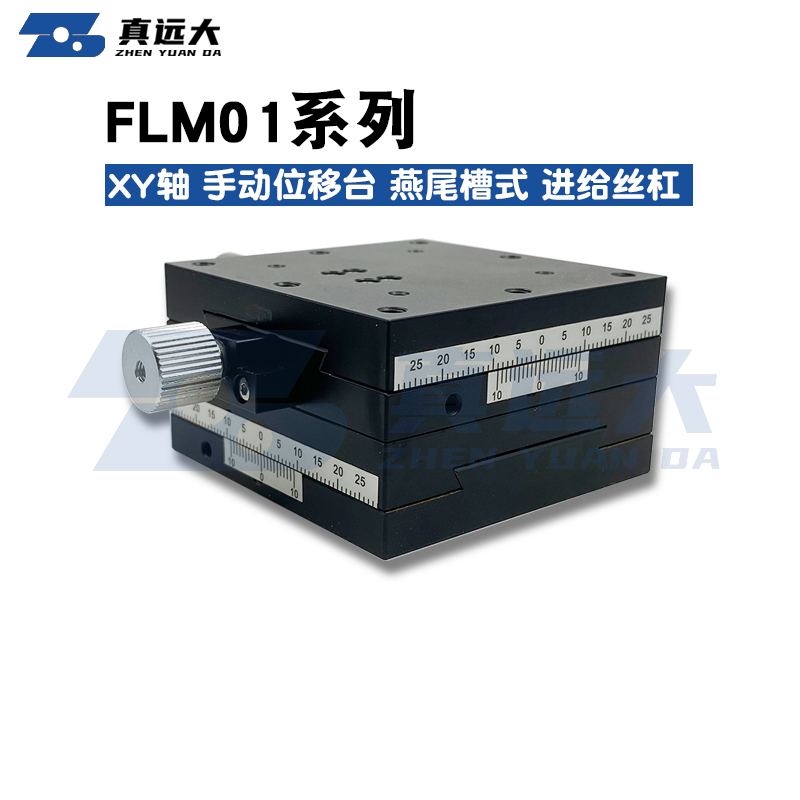 真远大FLM01系列燕尾槽型手动XY轴滑台是一款最小厚度为30mm的高精度滑台。可代替使用调整螺栓等的微调机构。因其主体采用无镉黄铜,容许力矩负载有保证。