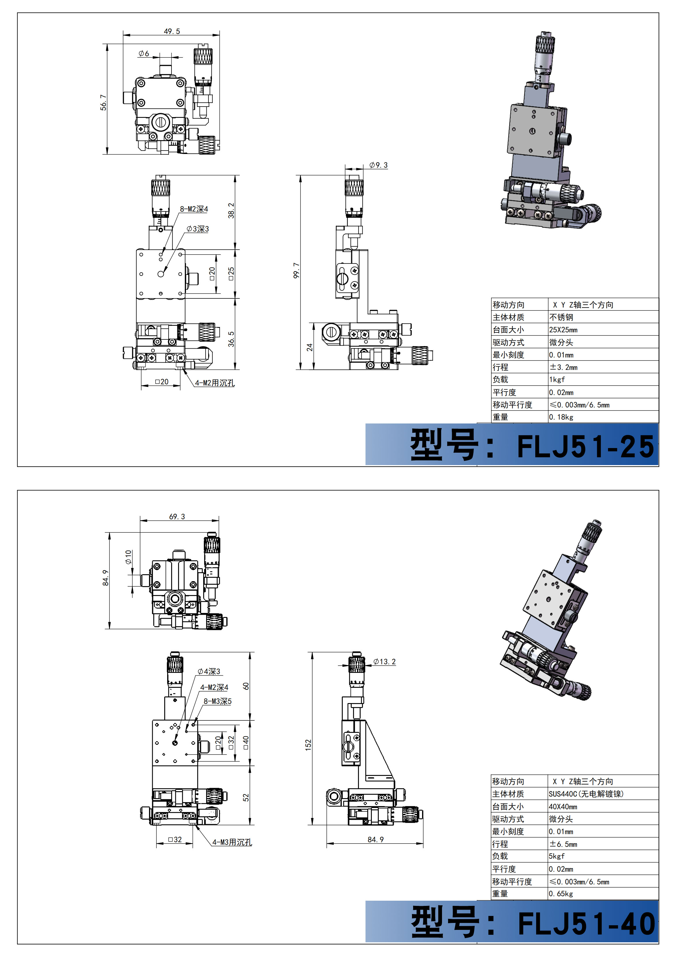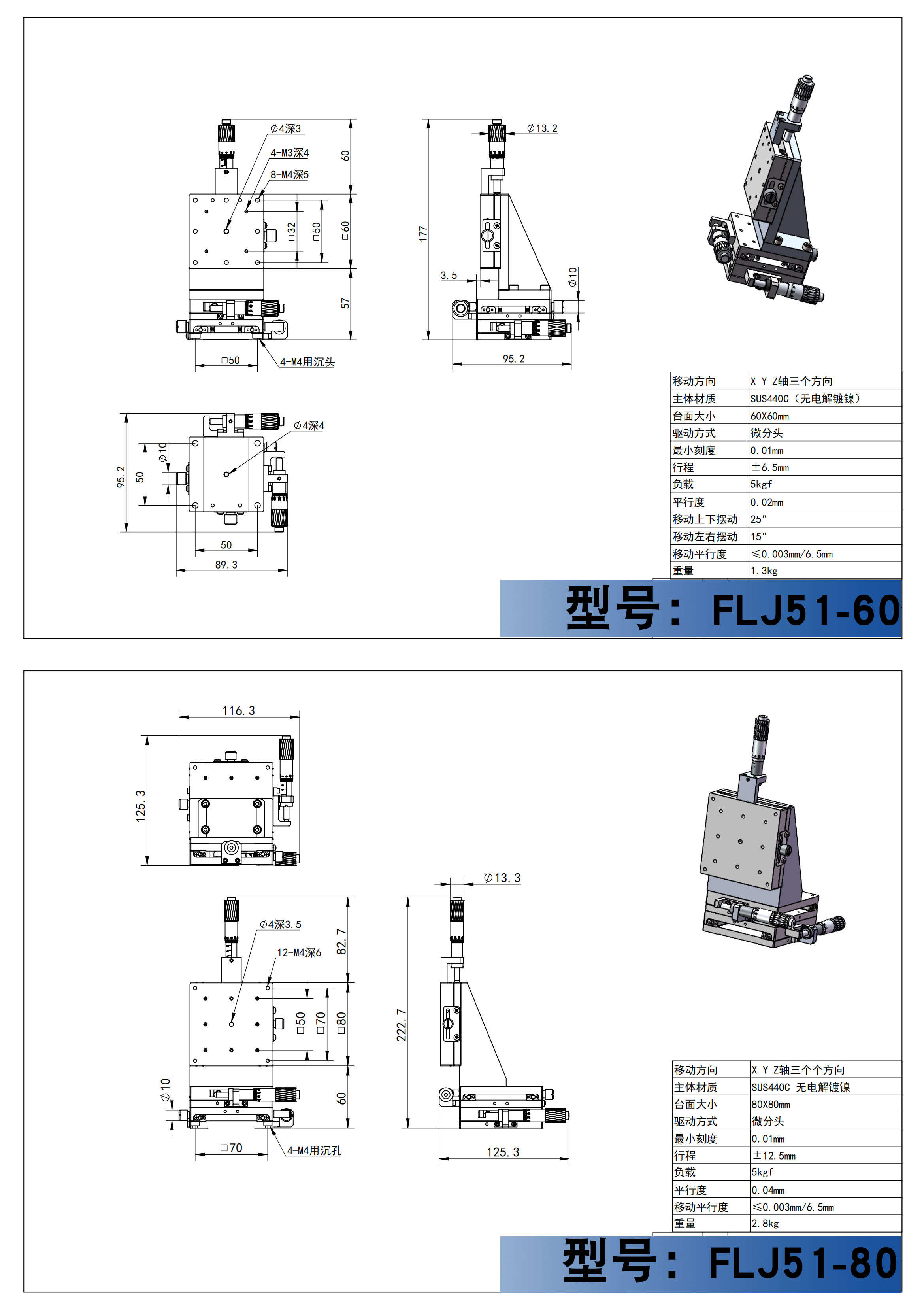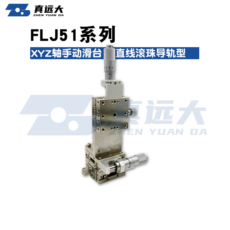 真理想XYZ轴直线滚珠导轨型手动滑台FLJ51,采用不锈钢制造,实现了高精度、高刚性。本体表面处理可根据所需选择无电解镀镍或低温镀黒铬。