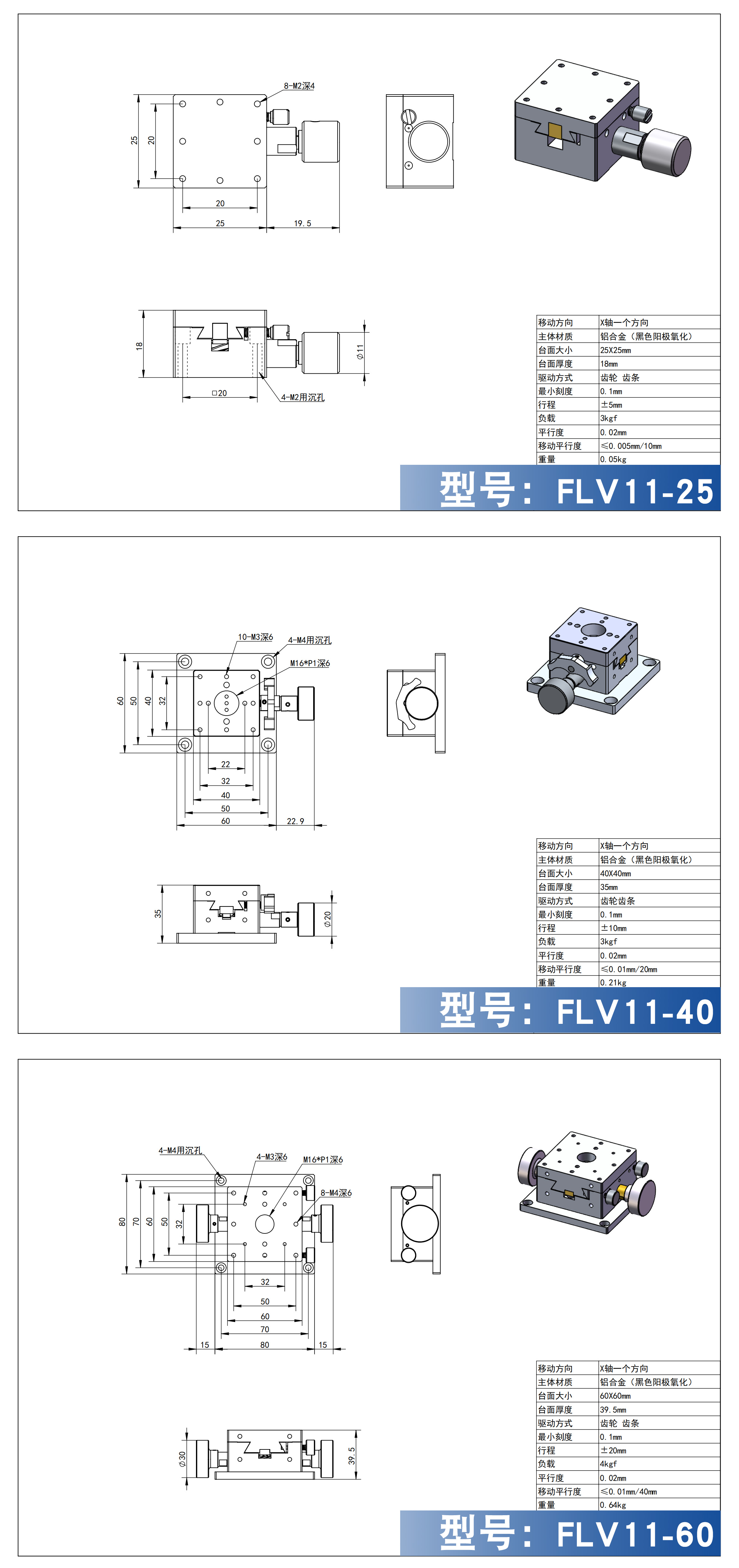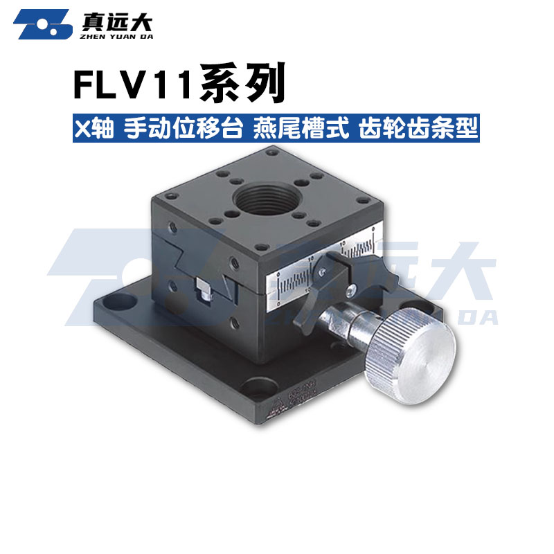 真远大FLV11系列燕尾槽齿轮齿条型手动X轴滑台是一款高精度滑台,其台面采用正方形形状。由于40、60款中间采用M16通孔,便于设备排线。
