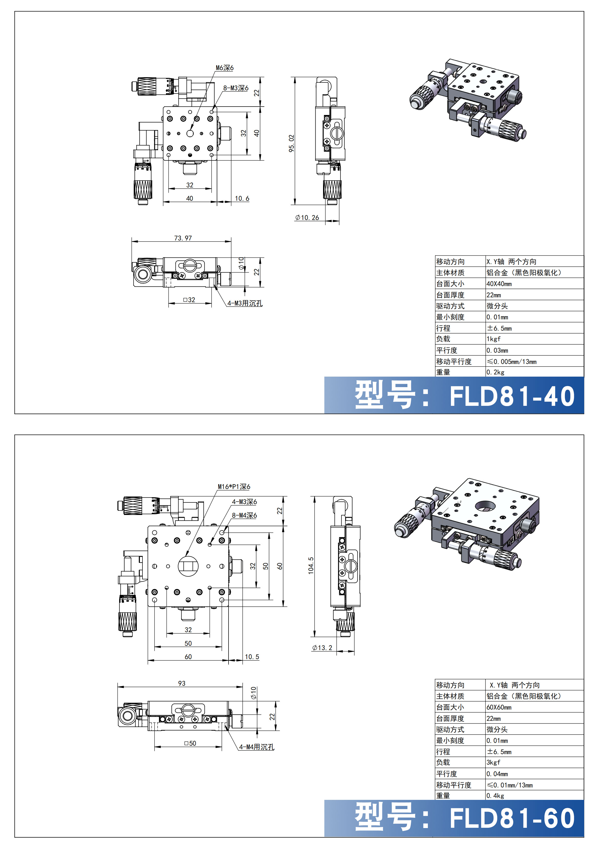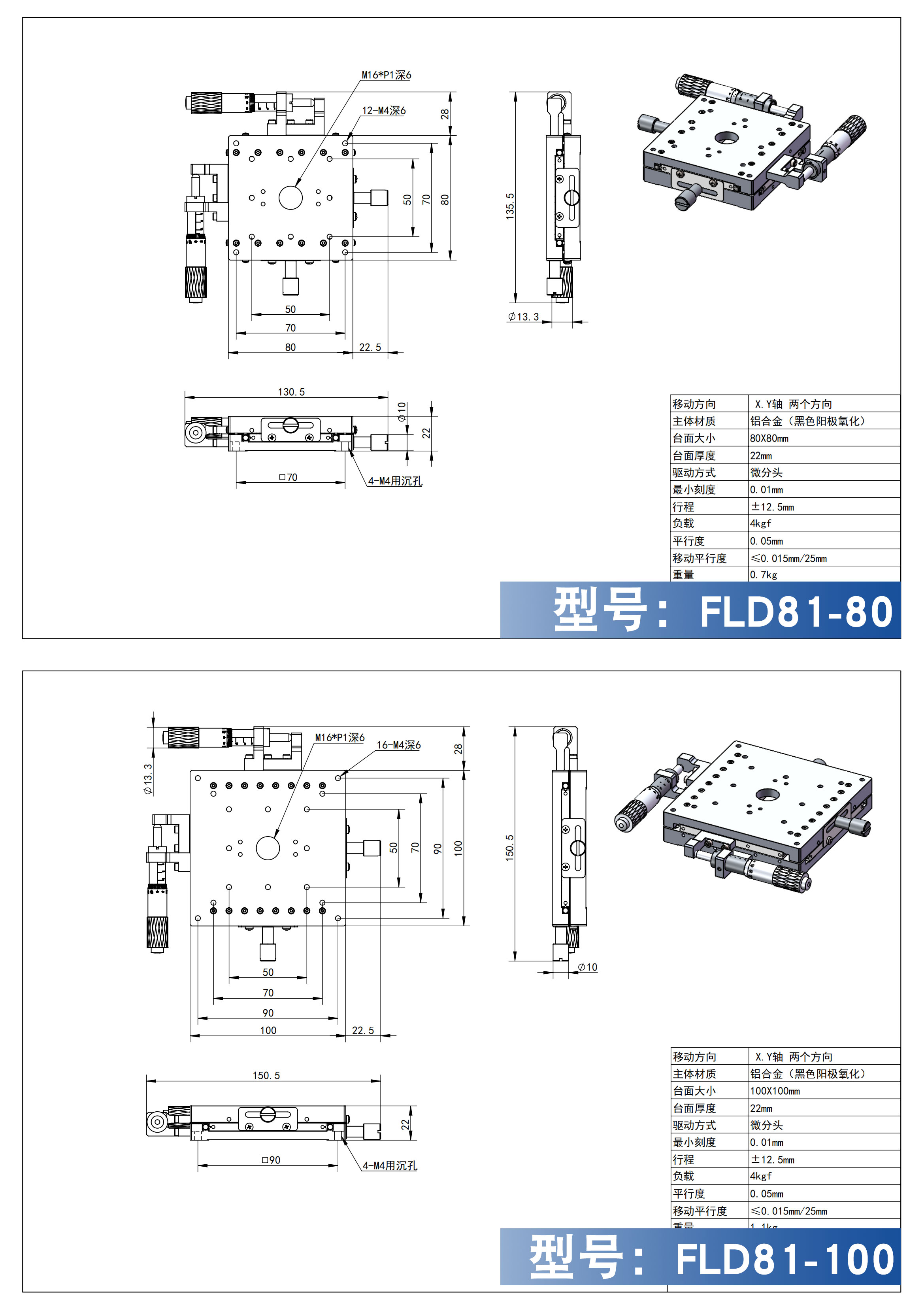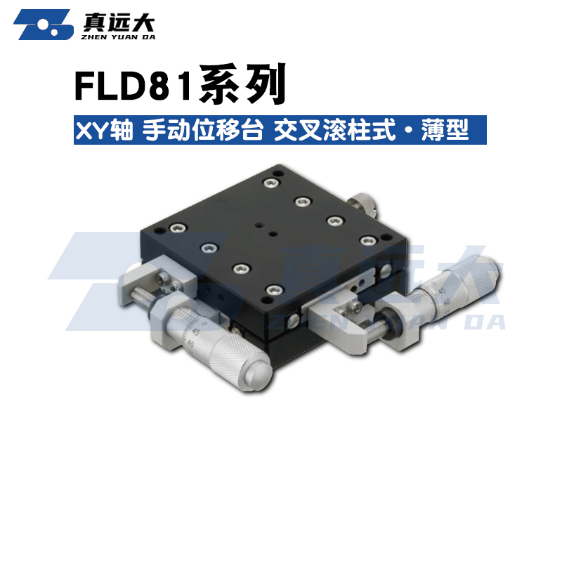 真远大手动XY轴交叉滚子导轨型位移滑台FLD81是一款中精度滑台。结构上使用了两组特制交叉滚子导轨呈直交排列,使其空间更加紧凑。