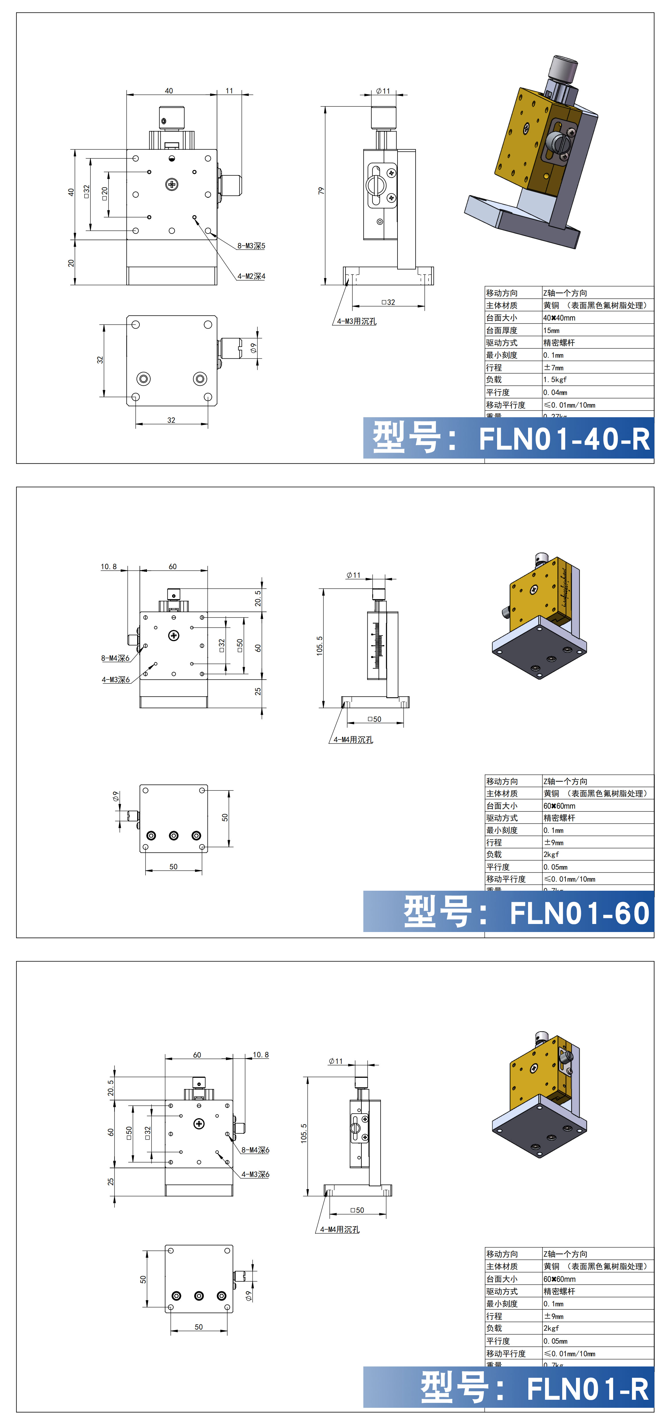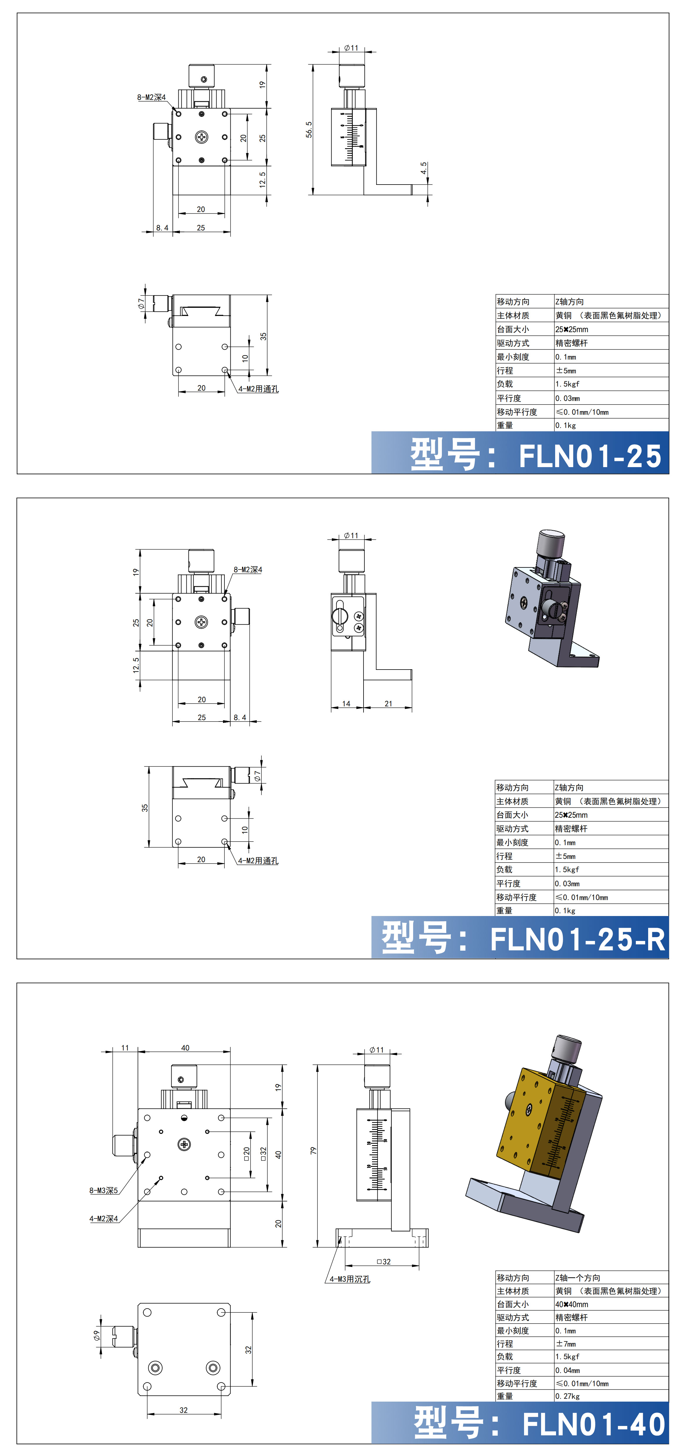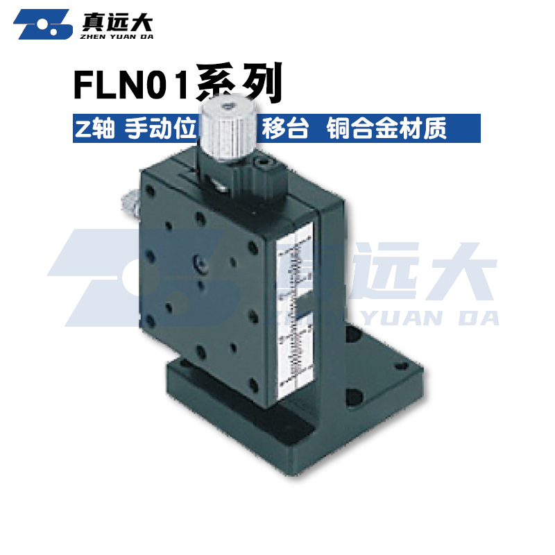 真远大FLN01系列燕尾槽型手动Z轴滑台是一款最小厚度为15mm的高精度滑台。可代替使用调整螺栓等的微调机构。因其主体采用无镉黄铜,容许力矩负载有保证。